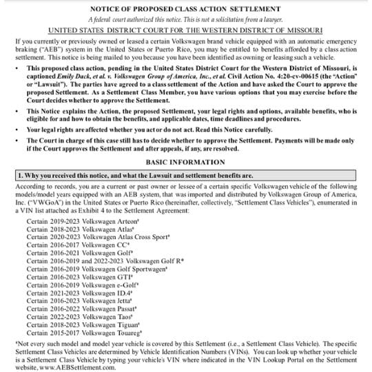 As a participant in the class action lawsuit regarding Volkswagen and Audi’s Automatic Emergency Braking (AEB) systems, affected owners are considered part of the settlement class, which includes certain models and model years of Volkswagen and Audi vehicles equipped with an AEB system.